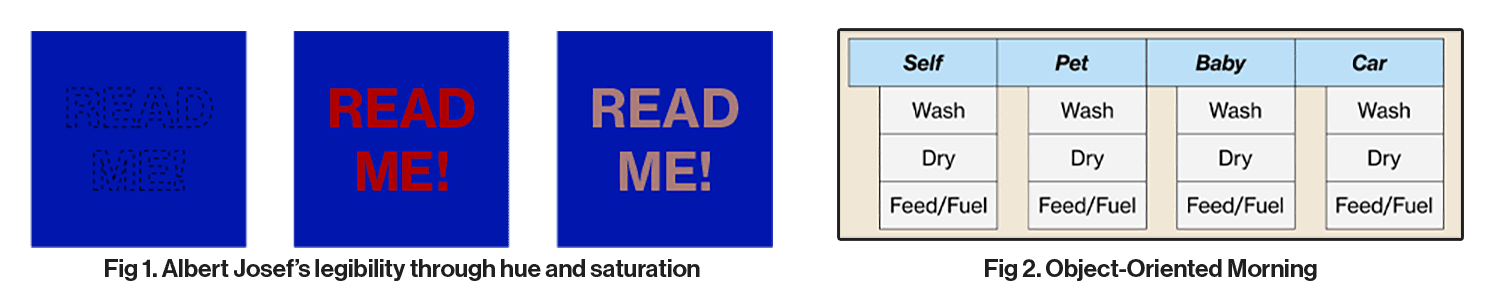 Two core concepts shown above involved contrast and object theory. Albert Josef's theory of contrast mandated that two colors, alongside their different hues, have differing saturations to decrease eye strain. Object-Oriented mappings are illustrated through a morning routine, where tasks are first associated with their objects.