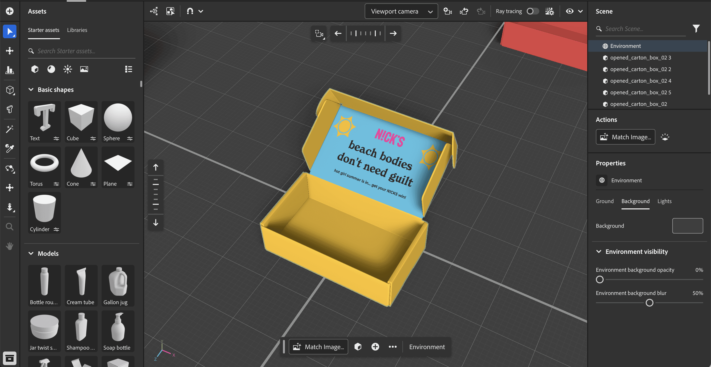 All 3D box mockups were created using a mix of Adobe Illustrator and Dimension. Base designs were created in Illustrator adhering to all brand colors and fonts, then stamped onto a model in Dimension before being rendered.