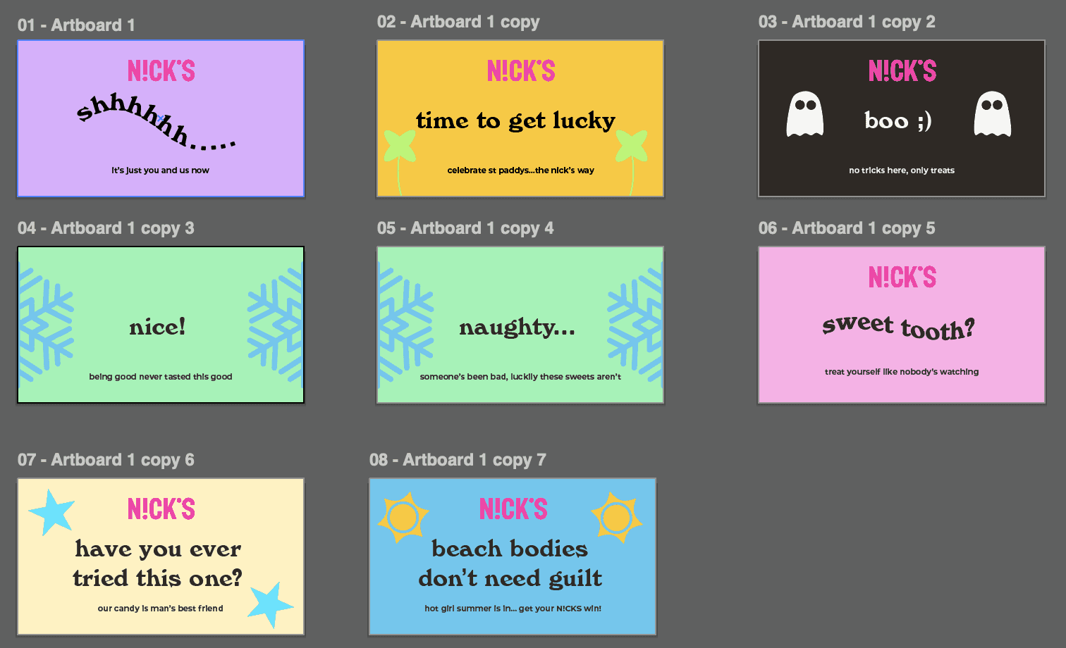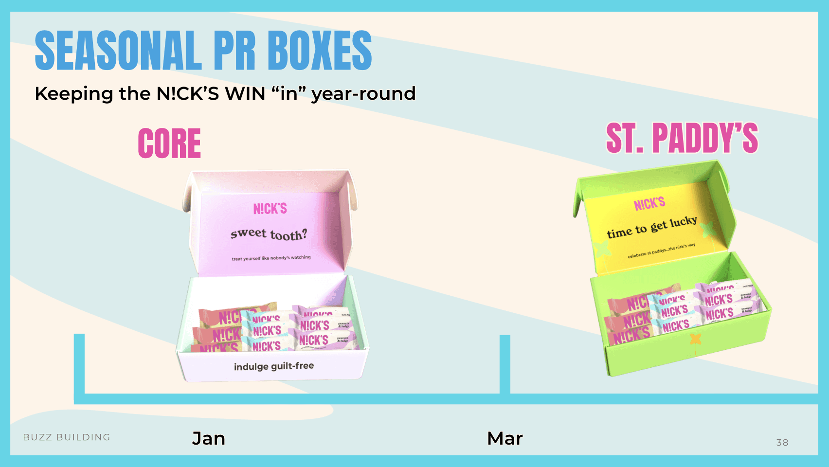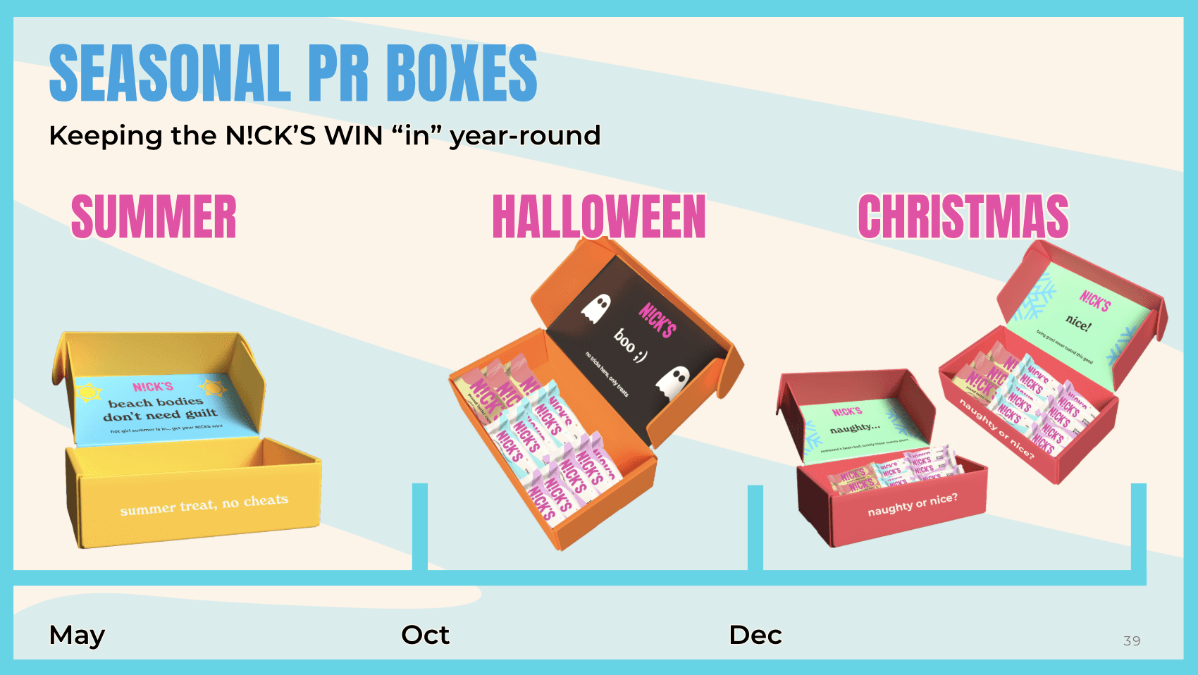 Alongside slide deck work, a core component of our project was influencer seeding. While the strategy team worked on identifying influencers which aligned with the Gen-Z, athletic, and raunchier brand of N!CK'S, I focused on created striking PR Box visuals to sell N!CK'S throughout every season.
